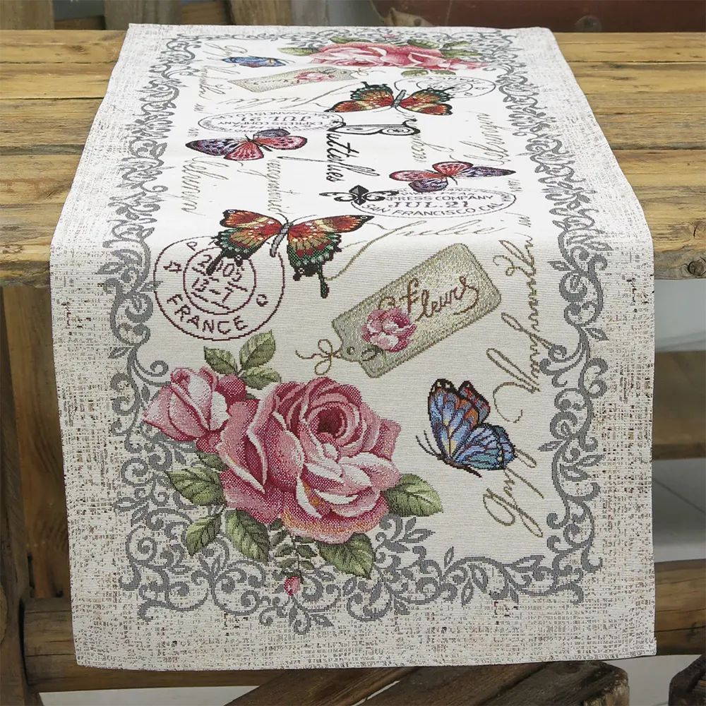 Az angolrózsa és pillangó klasszikus mintavilága vintage eleganciát csempész étkezőnkbe ennek a 44x140 cm méretű futó asztalterítőnek a segítségével.