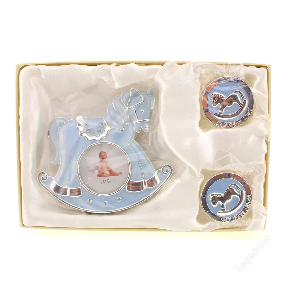 Ez a kedves, kék színvilágú babaajándék szett egy kedves képkeretet és egy első fog és első hajtincs tartó dobozkát tartalmaz. Tökéletes ajándék babalátogatáskor, vagy akár keresztelőre.