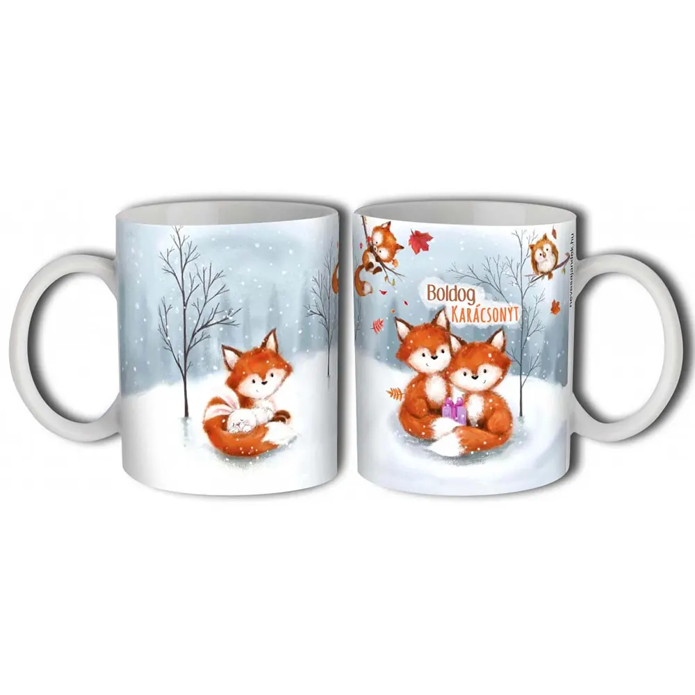 A róka figurák és a téli táj teszi igazán különlegessé ezt a karácsonyi bögrét.