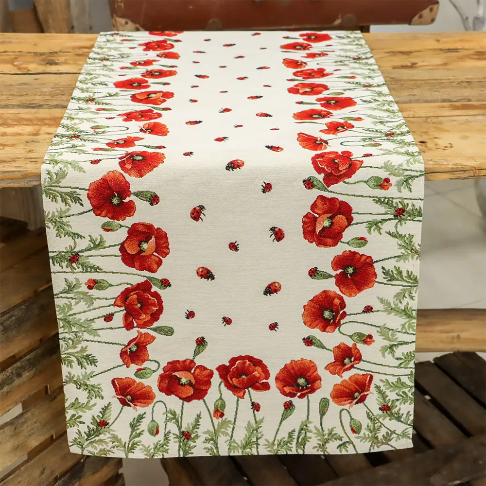 A katicák és a pipacs tökéletes harmóniája varázsolja különlegessé ezt a 44x140 cm méretű asztali futó terítőt.