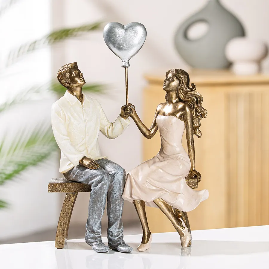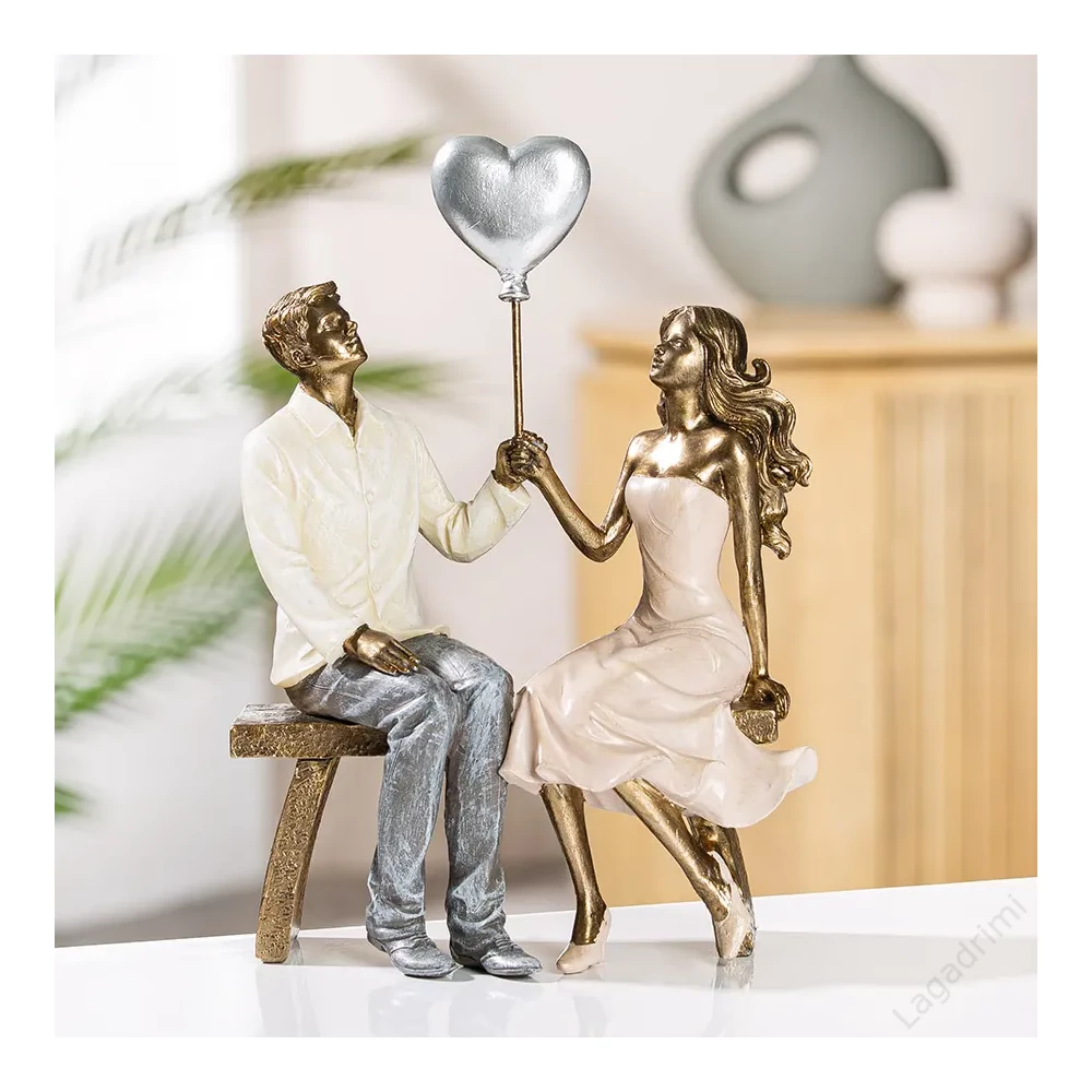 Ez a kedves, modern párszobor különleges színvilágával mind modern, mind klasszikus otthonokban jól mutat. A padon ülő, szívlufit tartó pár az összetartozás kifejezője.